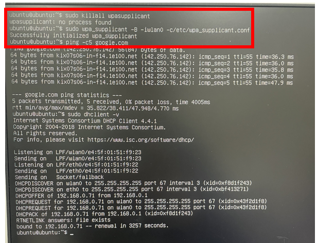 만약 부팅 전, network-config 파일을 수정하지 않아서 wifi 연결해야하는 경우, 아래의 코드를 써주면 된다.