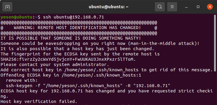ssh-keygen -f "/home/yeson/.ssh/known_hosts" -R "192.168.0.71"