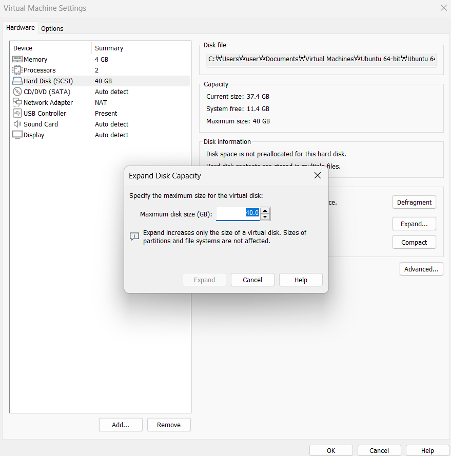 2) 현재 할당된 Hard Disk의 용량을 확인후, Expand 버튼을 클릭한다.