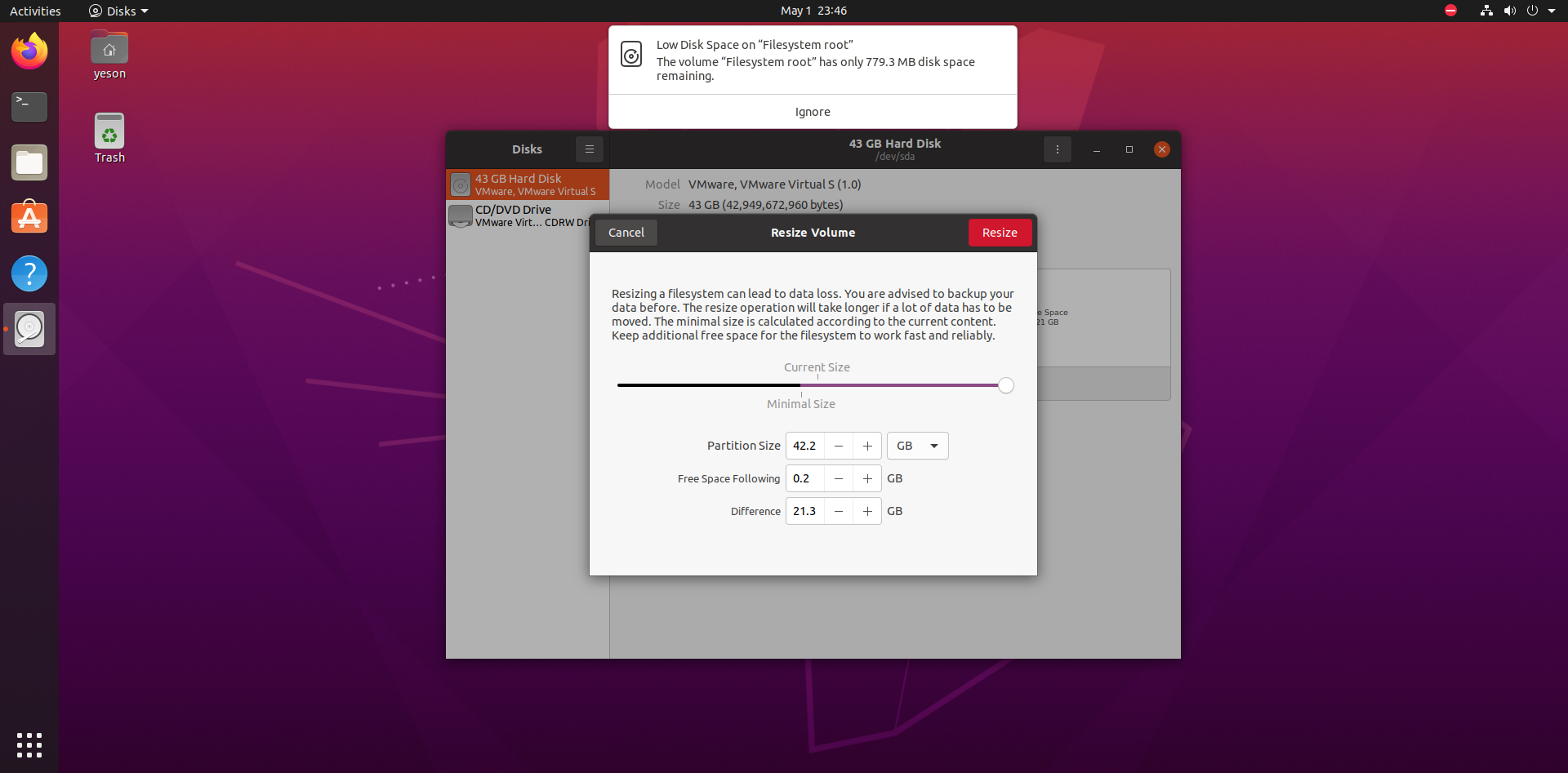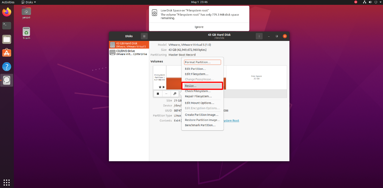 1) 리눅스 machine을 실행시킨 후, Disks 실행시킨다. 이 때, 사이즈 변경하려는 partition의 resize를 클릭한다.