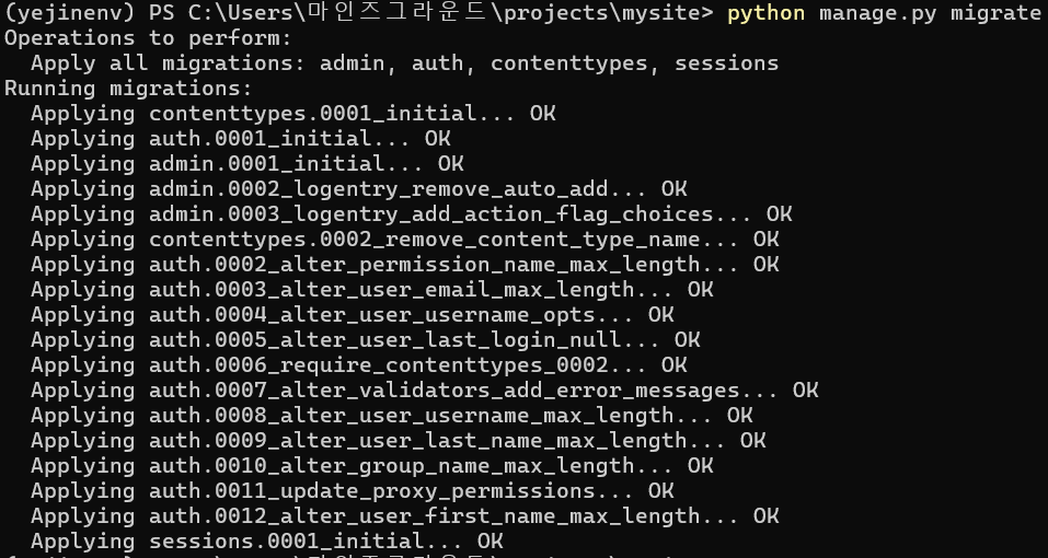 (yejinenv) C:\projects>cd mysite