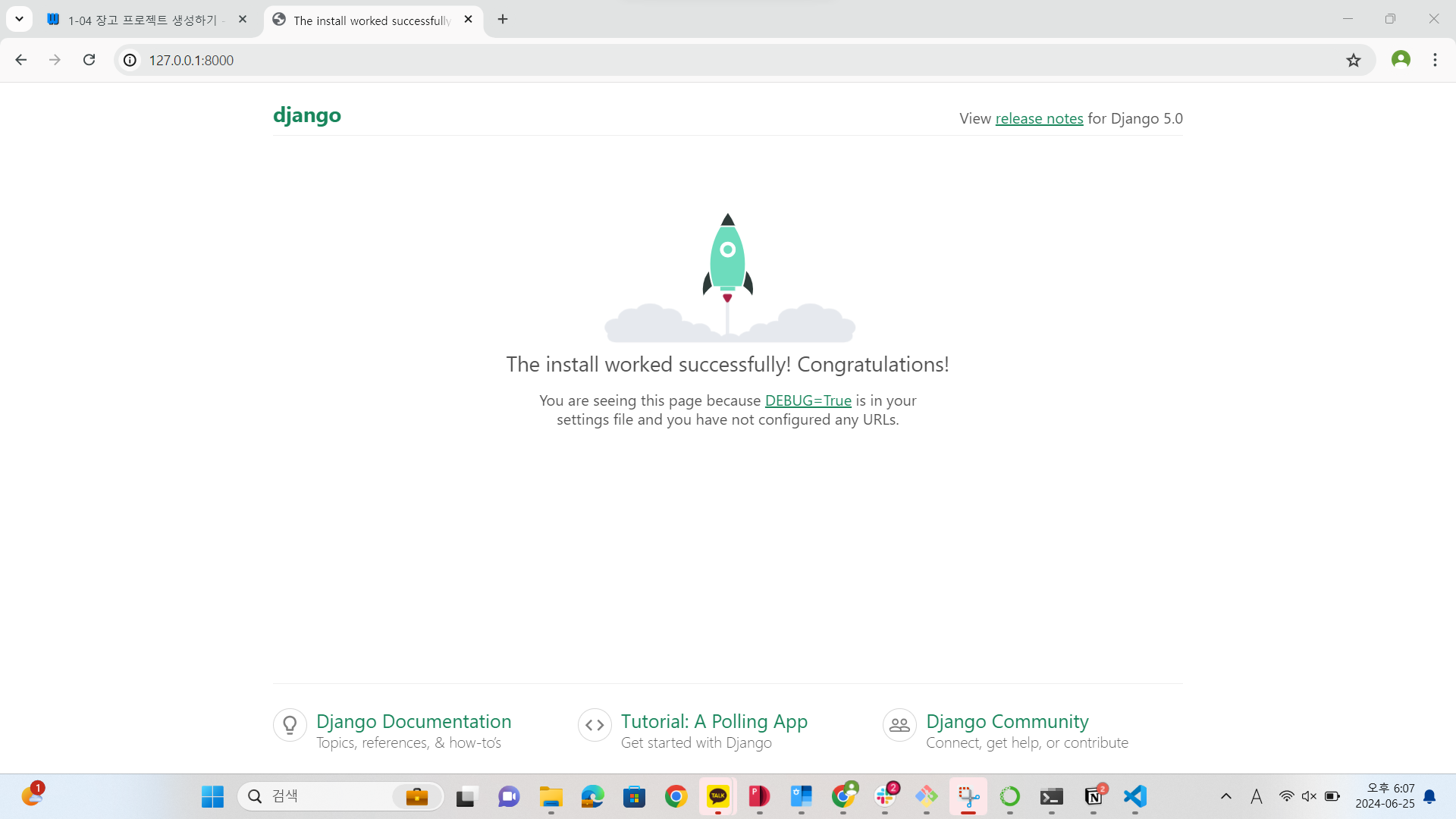 이제 웹브라우저를 열고 주소창에 http://127.0.0.1:8000/을 입력해 보자.