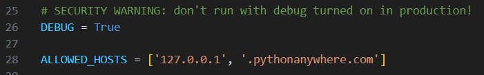 애플리케이션을 배포할 때 PythonAnywhere의 호스트 이름과 일치하지 않으므로 다음 설정을 아래와 같이 변경해줘야 한다.