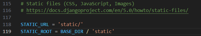 파일의 끝(end)으로 내려가서, STATIC_URL항목 바로 아래에 STATIC_ROOT을 추가