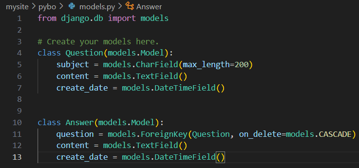 이를 바탕으로 질문(Question)과 답변(Answer)에 해당되는 모델을 pybo/models.py 파일에 정의해 보자.