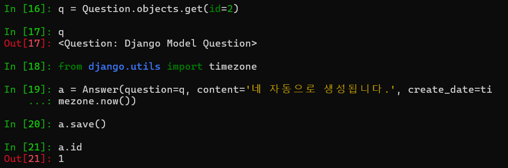 >>> a = Answer(question=q, content='네 자동으로 생성됩니다.', create_date=timezone.now())