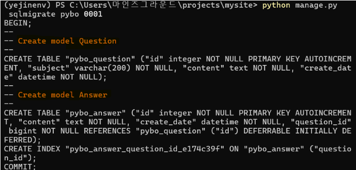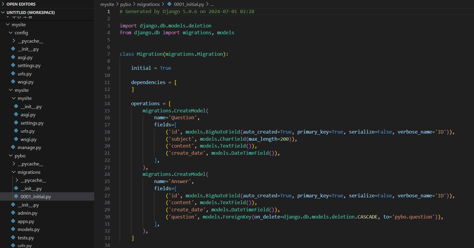 위 명령을 수행하면 pybo\migrations\0001_initial.py 라는 파이썬 파일이 자동으로 생성된다.