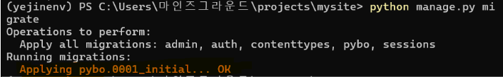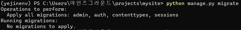 이제 python manage.py migrate 명령을 실행하여 해당 앱들이 필요로 하는 데이터베이스 테이블들을 생성해 보자.