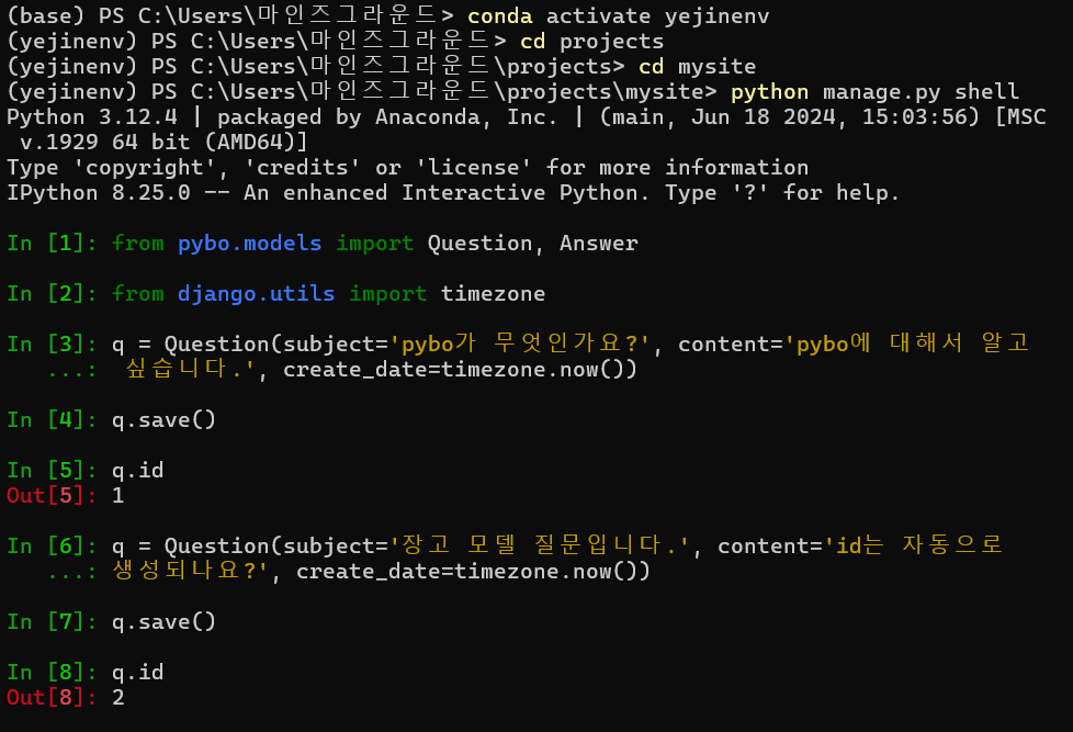 이번에는 모델 사용법을 장고 셸로 익혀보자. 장고 셸은 다음과 같이 실행할 수 있다.