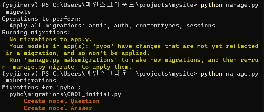 왜냐하면 모델이 신규로 생성되거나 변경되면 makemigrations 명령을 먼저 수행한 후에