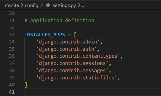 장고 프로젝트 생성시 기본적으로 설치되는 앱들은 config/settings.py파일에서 확인할 수 있다.
