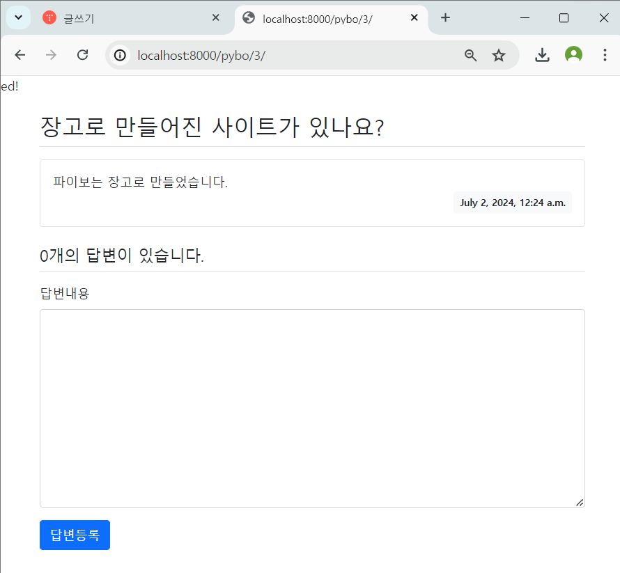 이어서 질문 상세 템플릿에도 다음처럼 부트스트랩을 적용하자.
