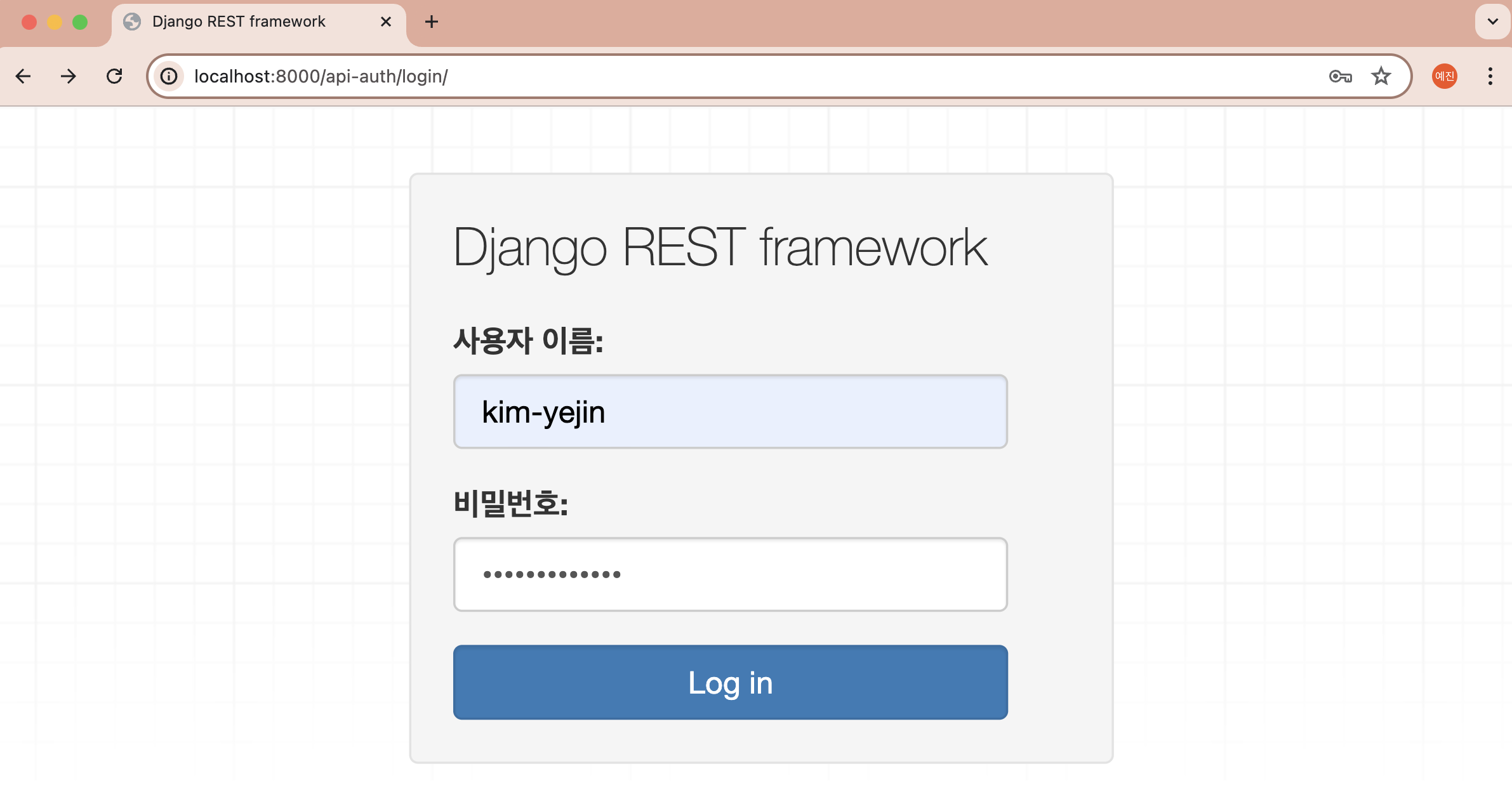 잘 설치되었는 지 확인하기 위해 DRF에서 편의를 위해 제공하는 기본 로그인/로그아웃 뷰를 활용해보자.