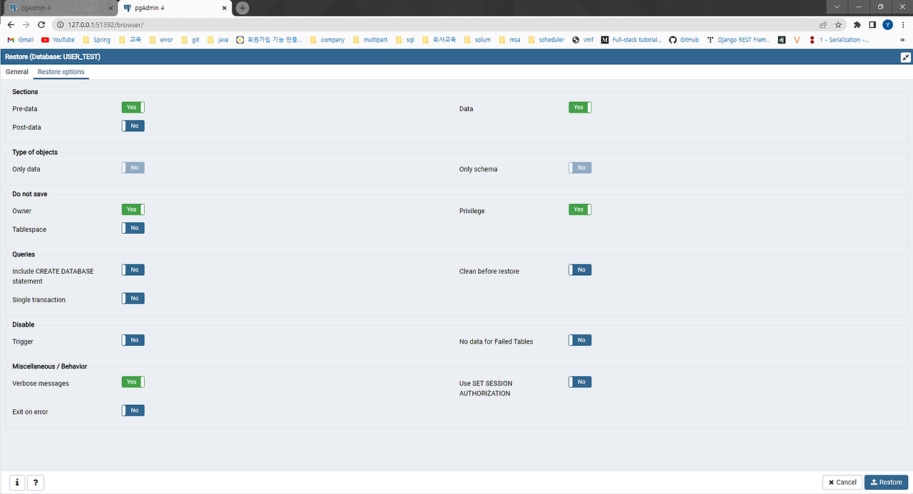 4) 데이터베이스에 restore을 누른 후 backup 파일을 선택해주고 아래와 같이 설정해준다.