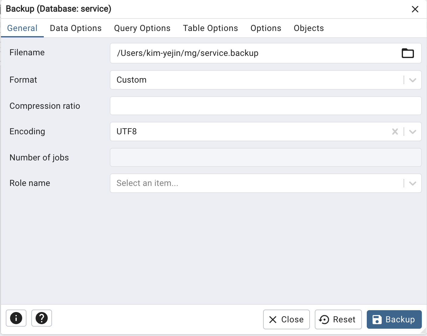2. Filename .. 클릭하여 저장할 경로(dump 폴더) 지정 후, 뒷 부분 확장명 ".backup"으로 변경