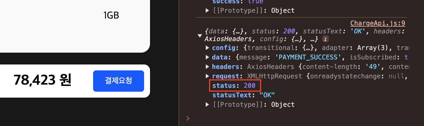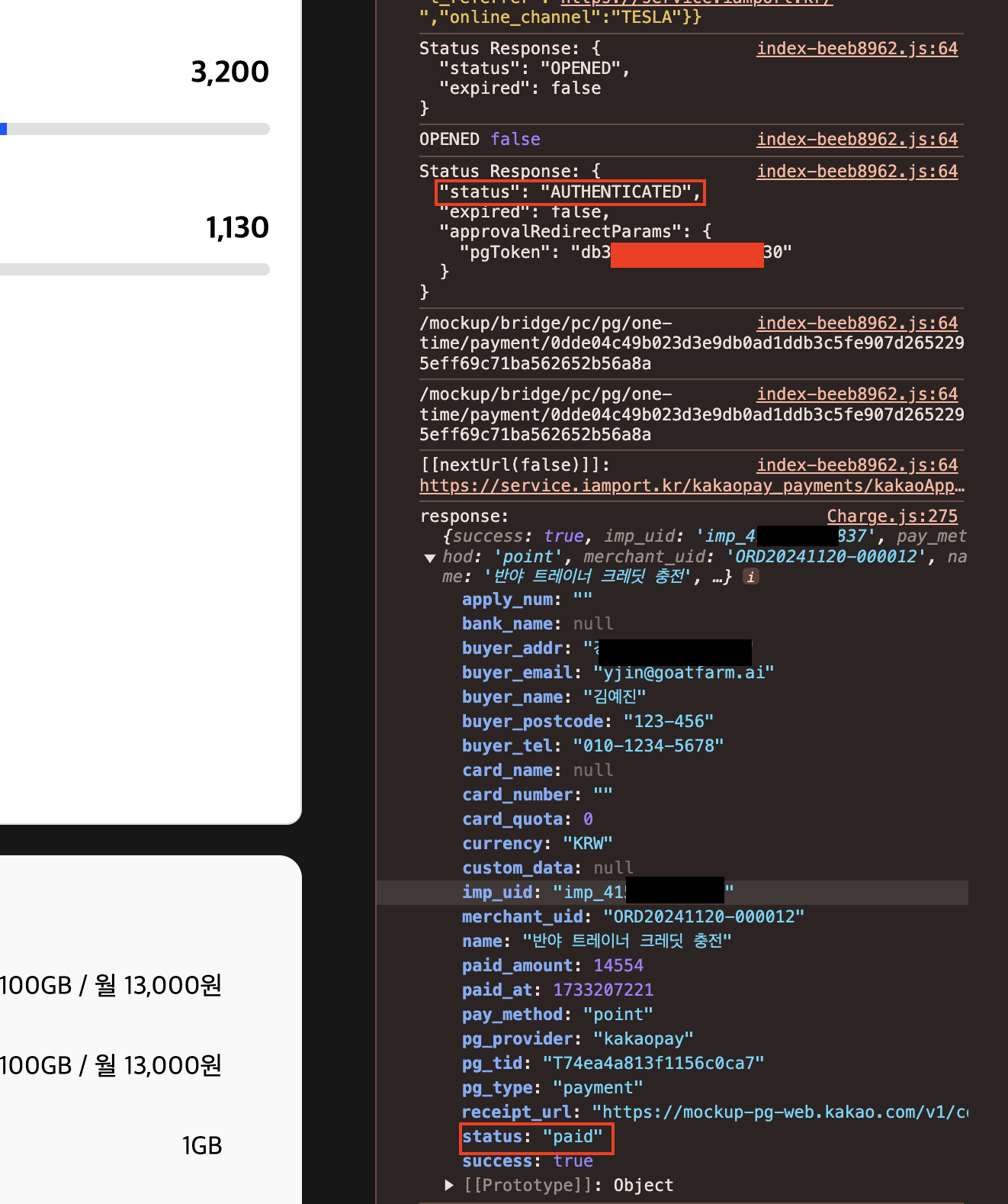 status가 결제 전 "AUTHENTICATED" 에서 결제 완료 후, "paid"로 된 것을 볼 수 있다.