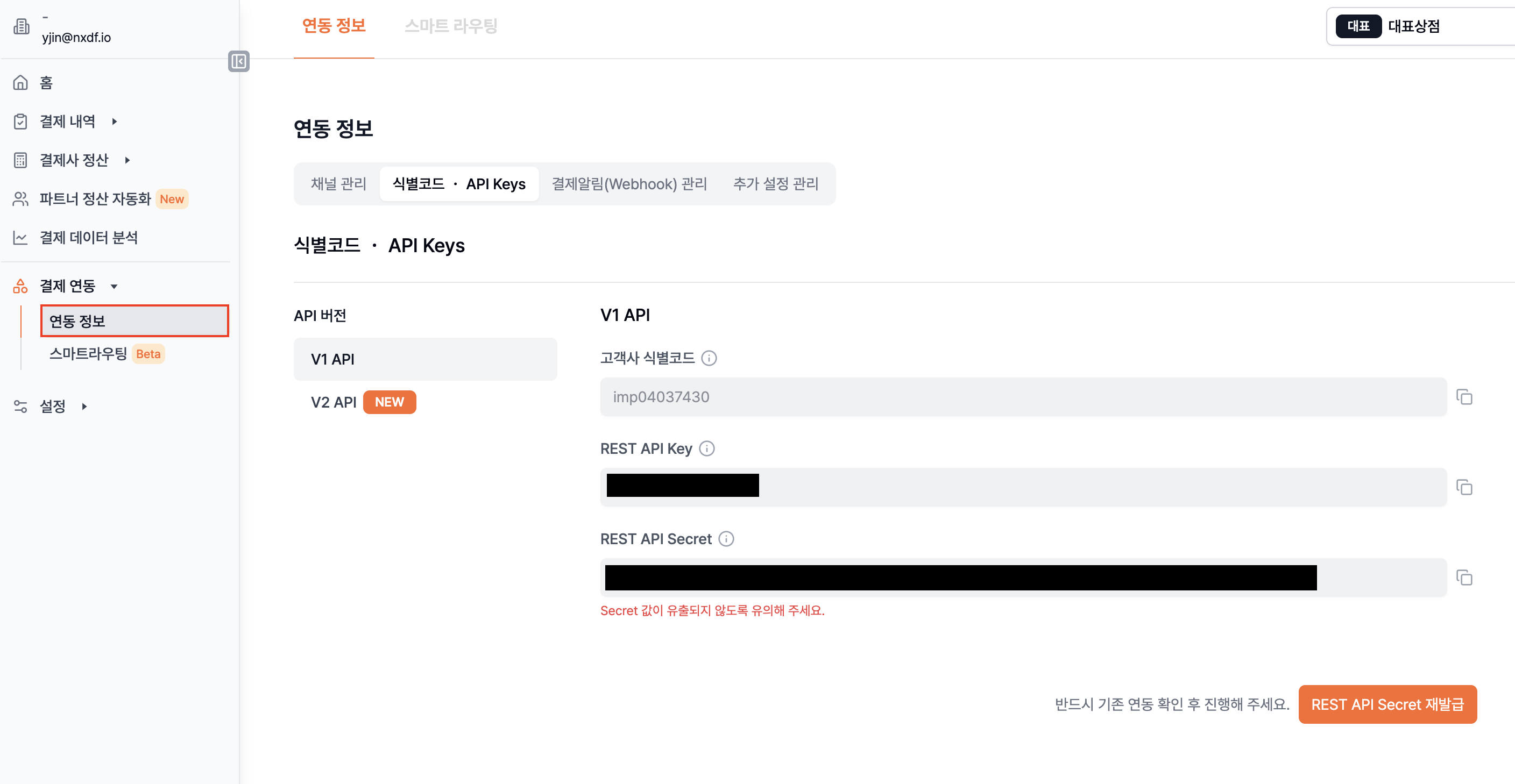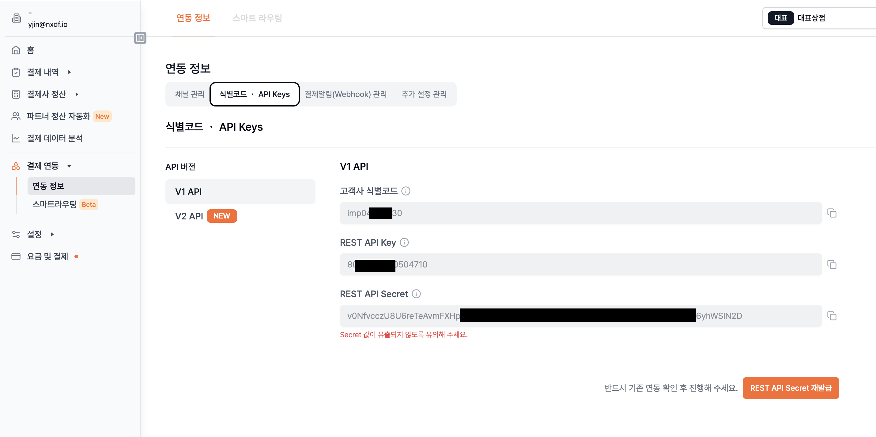 포트원 결제 연동 > 연동 정보 > 식별코드 & API Keys에서 확인 가능