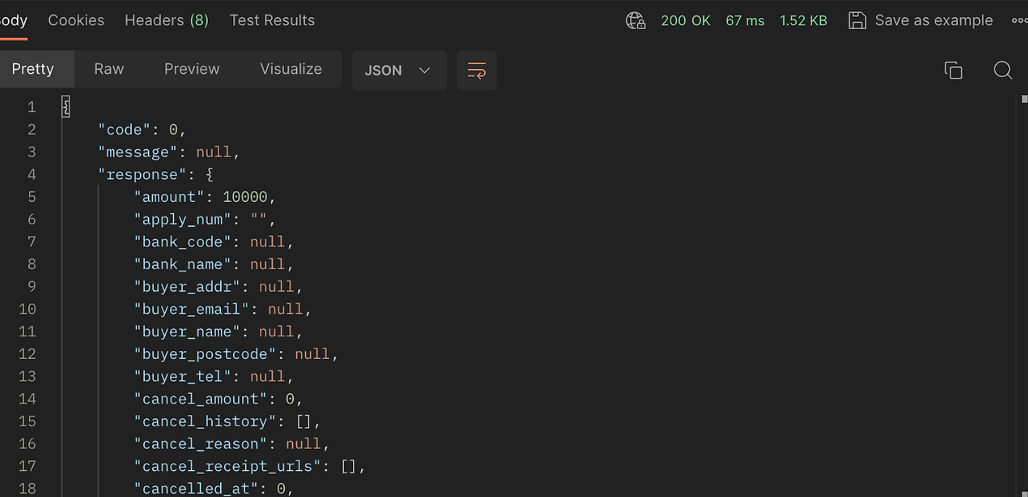 해당 백앤드 설정을 모두 완료 후, 테스트 결제를 하면 아래와 같은 Response가 온다.