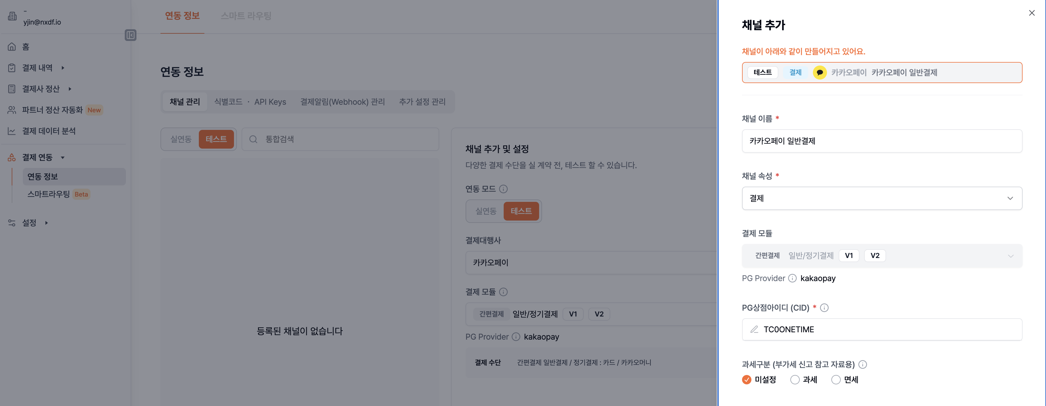 그리고 아래와 같이 전자 결제 테스트용으로 신청해줍니다.