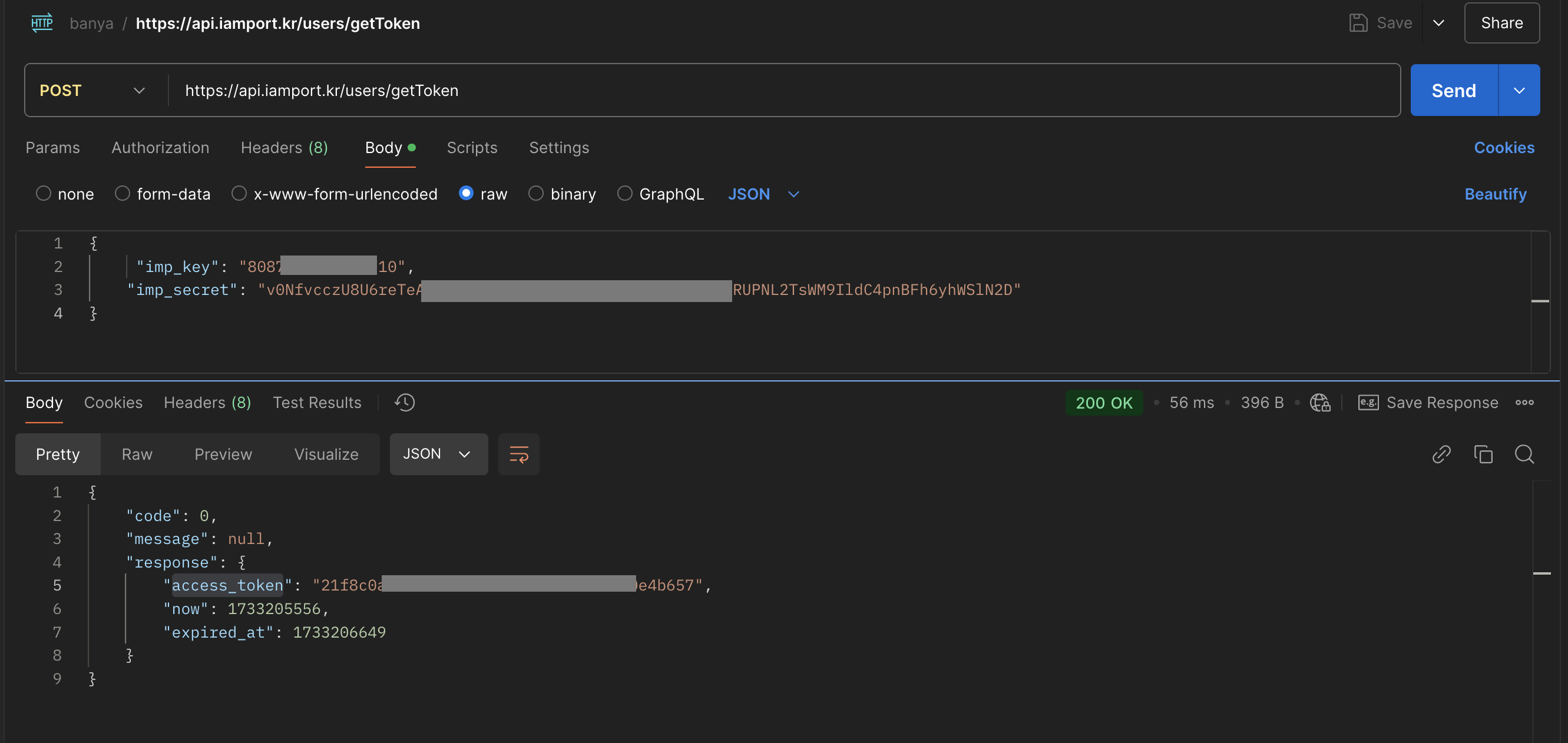 1. 포트원 api (https://api.iamport.kr/users/getToken)에 imp_key와 imp_secret를 바디로 보내서 access_token을 받아옴.