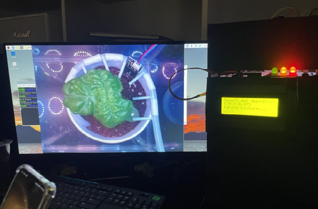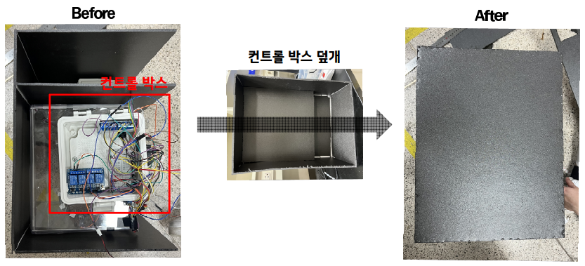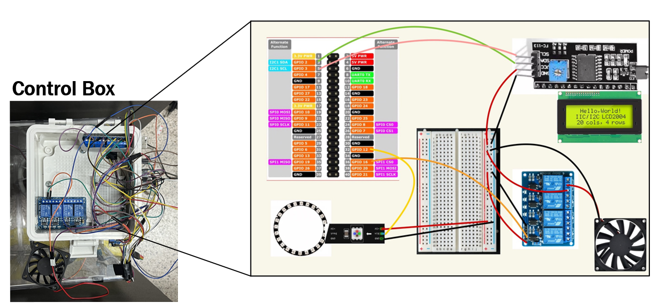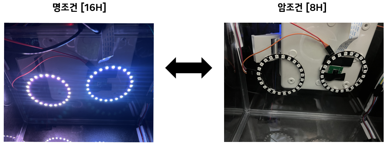 환경 모니터링 및 제어 | 컨트롤 박스 덮개와 여닫이 문을 이용해 암조건을 줌으로써 원하는 광주기로 제어할 수 있으며, LCD 모니터 & 신호등 모듈로 문/덮개를 열지 않고도 스마트 온실 내 환경을 모니터링 할 수 있음.