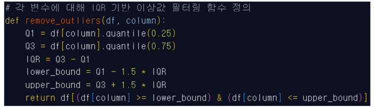 추려내고자 했다. 이 때 이상값 판단 기준은 사분위수를 이용했고, 데이터의 중간 50% 구간을 IQR로 잡아